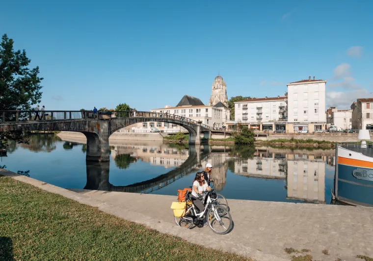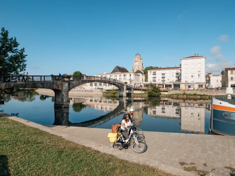 No particular difficulties along this stage of La Flow Vélo. There’s a mix of small roads and stretches on towpaths, a delight for cyclists. The way is perfect for pottering along by bike; and relish the river crossings via little chain-operated ferries. Take care after Les Gonds, up to the entrance to Saintes, where you need to follow the ‘Chaucidou’ – on this narrow road, there are restrictions for motorized traffic, while riders keep to the coloured band reserved for cyclists. From the footbridge over the Né, signposting is mainly on wooden markers.
